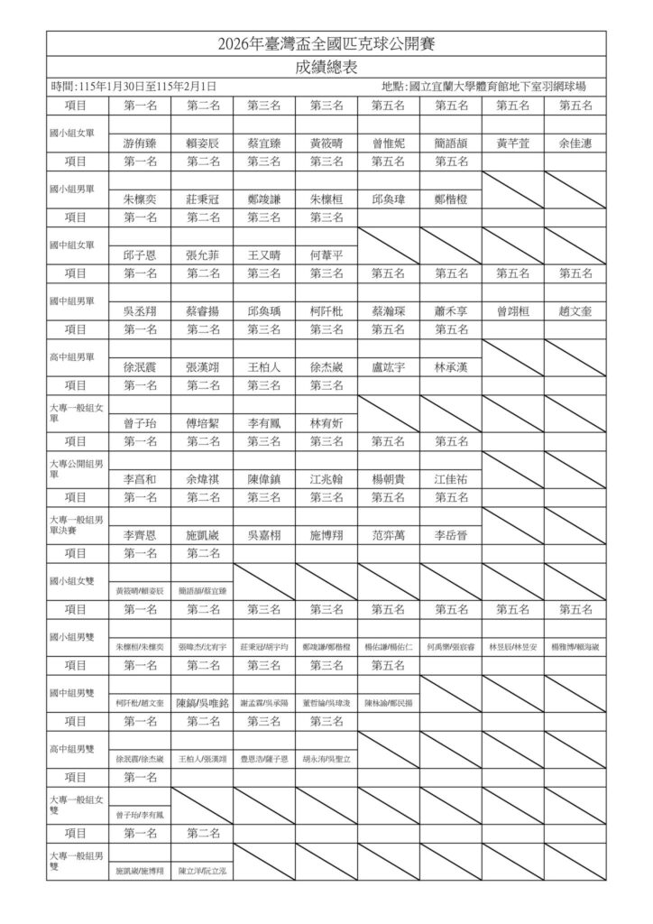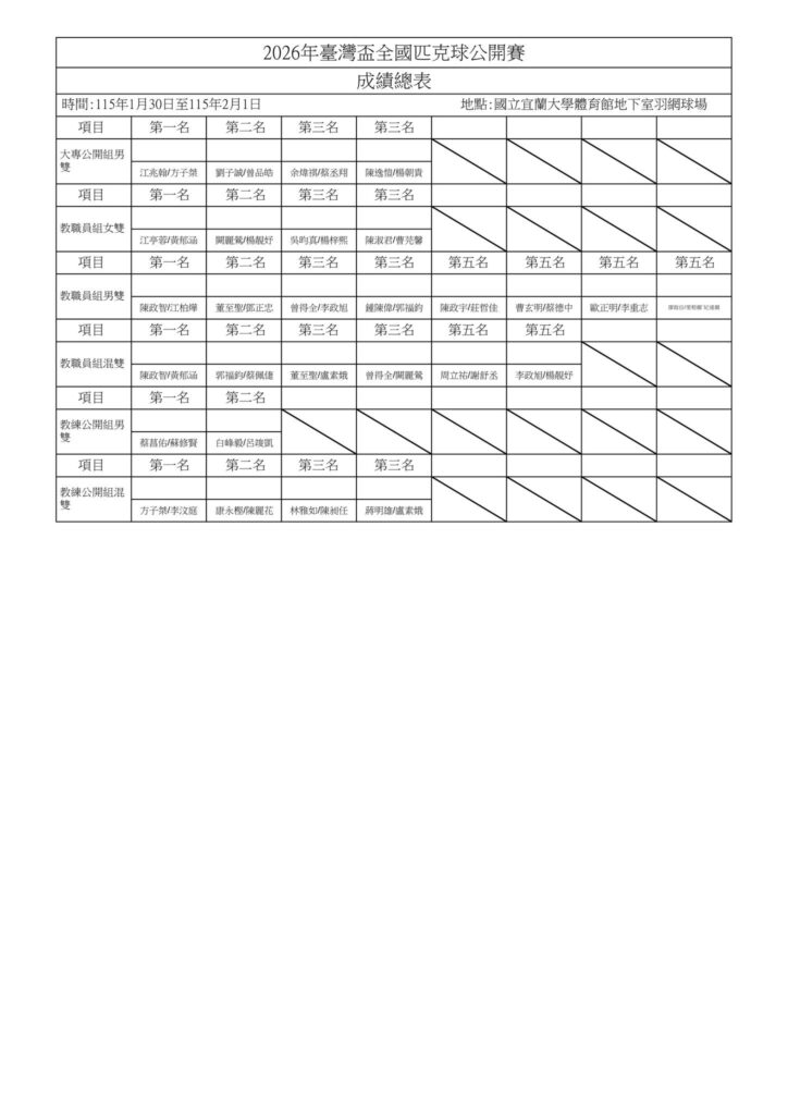 - 社會公開組:男雙、女雙、混雙。