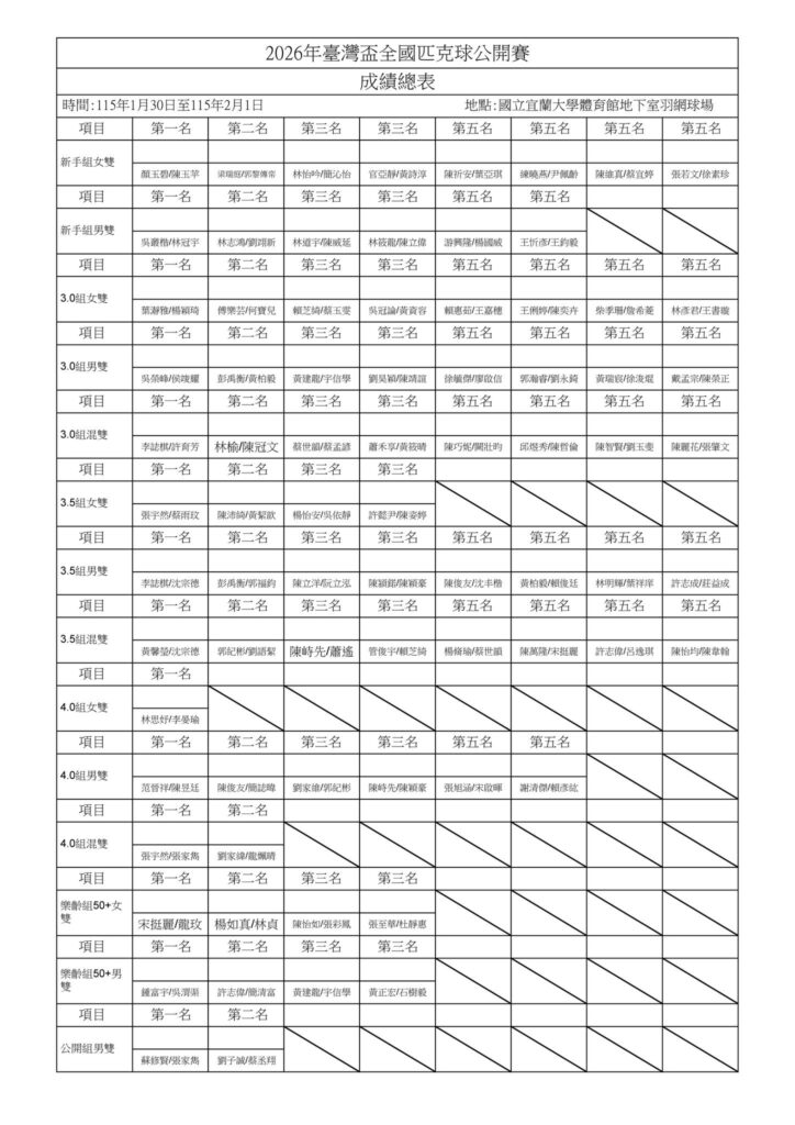 - 社會新手組:男雙、女雙。