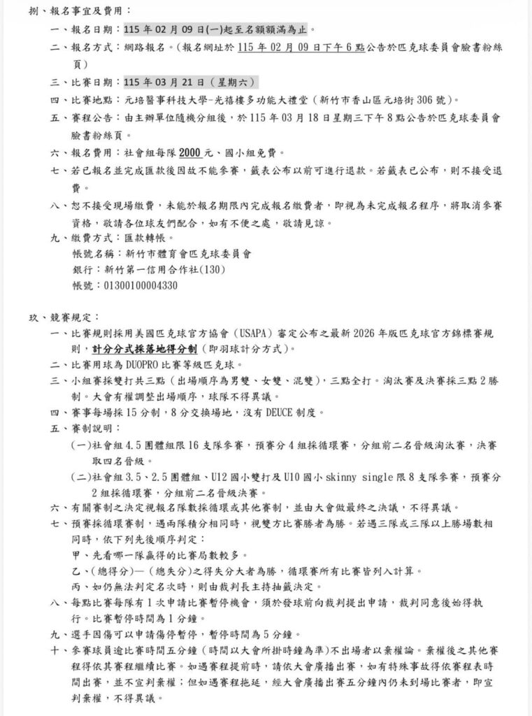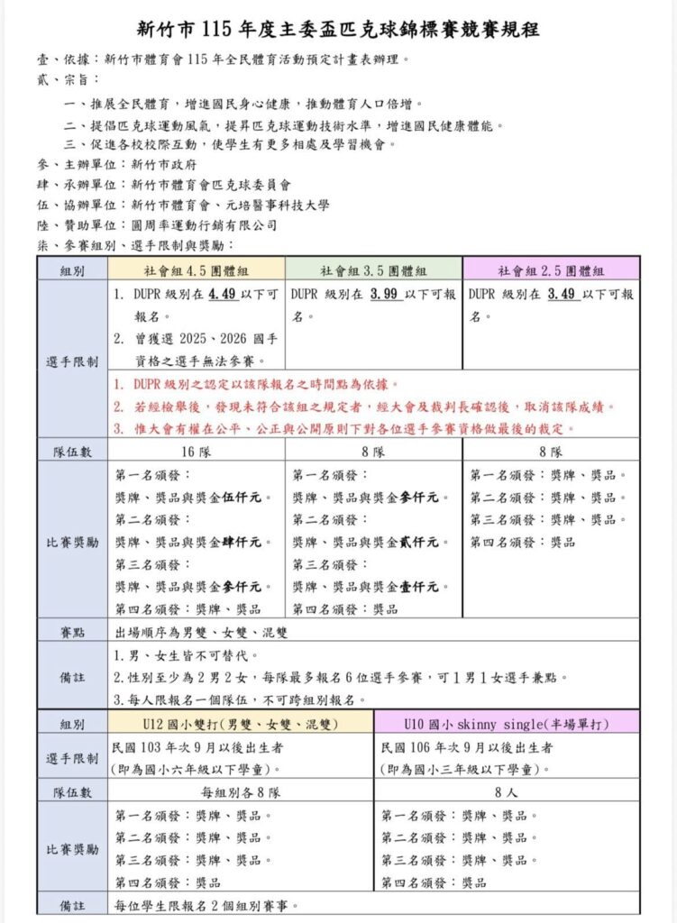 新竹市115年主委盃匹克球賽